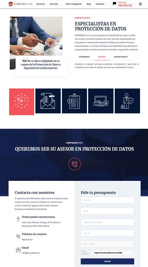 Forprodat CYL ha apostado por una pagina web dinámica y atractiva con colores adaptados a su logo rojo y negro, en este caso se trata de una página web creada con wordpress con más de seis secciones internas, que informan de todos los servicios ofrecidos por la empresa, forma de trabajar para que tu negocio pueda adecuarse a la legislación vigente sobre protección de datos.
